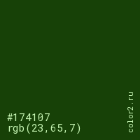 Цвет #174107 в цветовой модели RGB обозначается тремя октетами (23, 65, 7) в десятичном формате и #174107 в шестнадцатиричном (hex) формате, которые являются интенсивностью красного 23 (hex 17), интенсивность зелёного 65 (hex 41) и интенсивность синего 7 (hex 07).
