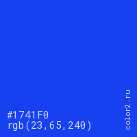 Цвет #1741F0 в цветовой модели RGB обозначается тремя октетами (23, 65, 240) в десятичном формате и #1741F0 в шестнадцатиричном (hex) формате, которые являются интенсивностью красного 23 (hex 17), интенсивность зелёного 65 (hex 41) и интенсивность синего 240 (hex F0).