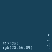 Цвет #174259 в цветовой модели RGB обозначается тремя октетами (23, 66, 89) в десятичном формате и #174259 в шестнадцатиричном (hex) формате, которые являются интенсивностью красного 23 (hex 17), интенсивность зелёного 66 (hex 42) и интенсивность синего 89 (hex 59).