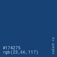 Цвет #174275 в цветовой модели RGB обозначается тремя октетами (23, 66, 117) в десятичном формате и #174275 в шестнадцатиричном (hex) формате, которые являются интенсивностью красного 23 (hex 17), интенсивность зелёного 66 (hex 42) и интенсивность синего 117 (hex 75).