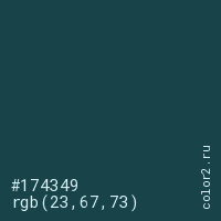 Цвет #174349 в цветовой модели RGB обозначается тремя октетами (23, 67, 73) в десятичном формате и #174349 в шестнадцатиричном (hex) формате, которые являются интенсивностью красного 23 (hex 17), интенсивность зелёного 67 (hex 43) и интенсивность синего 73 (hex 49).