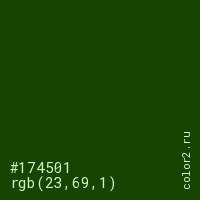 Цвет #174501 в цветовой модели RGB обозначается тремя октетами (23, 69, 1) в десятичном формате и #174501 в шестнадцатиричном (hex) формате, которые являются интенсивностью красного 23 (hex 17), интенсивность зелёного 69 (hex 45) и интенсивность синего 1 (hex 01).