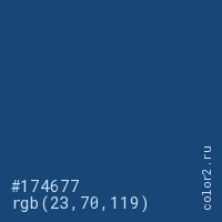 Цвет #174677 в цветовой модели RGB обозначается тремя октетами (23, 70, 119) в десятичном формате и #174677 в шестнадцатиричном (hex) формате, которые являются интенсивностью красного 23 (hex 17), интенсивность зелёного 70 (hex 46) и интенсивность синего 119 (hex 77).