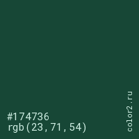 Цвет #174736 в цветовой модели RGB обозначается тремя октетами (23, 71, 54) в десятичном формате и #174736 в шестнадцатиричном (hex) формате, которые являются интенсивностью красного 23 (hex 17), интенсивность зелёного 71 (hex 47) и интенсивность синего 54 (hex 36).