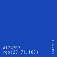 Цвет #1747B7 в цветовой модели RGB обозначается тремя октетами (23, 71, 183) в десятичном формате и #1747B7 в шестнадцатиричном (hex) формате, которые являются интенсивностью красного 23 (hex 17), интенсивность зелёного 71 (hex 47) и интенсивность синего 183 (hex B7).