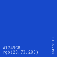 Цвет #1749CB в цветовой модели RGB обозначается тремя октетами (23, 73, 203) в десятичном формате и #1749CB в шестнадцатиричном (hex) формате, которые являются интенсивностью красного 23 (hex 17), интенсивность зелёного 73 (hex 49) и интенсивность синего 203 (hex CB).