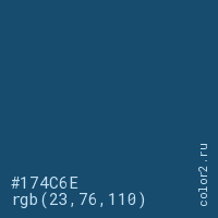 Цвет #174C6E в цветовой модели RGB обозначается тремя октетами (23, 76, 110) в десятичном формате и #174C6E в шестнадцатиричном (hex) формате, которые являются интенсивностью красного 23 (hex 17), интенсивность зелёного 76 (hex 4C) и интенсивность синего 110 (hex 6E).