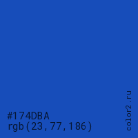 Цвет #174DBA в цветовой модели RGB обозначается тремя октетами (23, 77, 186) в десятичном формате и #174DBA в шестнадцатиричном (hex) формате, которые являются интенсивностью красного 23 (hex 17), интенсивность зелёного 77 (hex 4D) и интенсивность синего 186 (hex BA).