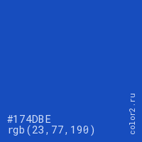 Цвет #174DBE в цветовой модели RGB обозначается тремя октетами (23, 77, 190) в десятичном формате и #174DBE в шестнадцатиричном (hex) формате, которые являются интенсивностью красного 23 (hex 17), интенсивность зелёного 77 (hex 4D) и интенсивность синего 190 (hex BE).