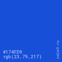 Цвет #174FD9 в цветовой модели RGB обозначается тремя октетами (23, 79, 217) в десятичном формате и #174FD9 в шестнадцатиричном (hex) формате, которые являются интенсивностью красного 23 (hex 17), интенсивность зелёного 79 (hex 4F) и интенсивность синего 217 (hex D9).