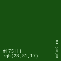 Цвет #175111 в цветовой модели RGB обозначается тремя октетами (23, 81, 17) в десятичном формате и #175111 в шестнадцатиричном (hex) формате, которые являются интенсивностью красного 23 (hex 17), интенсивность зелёного 81 (hex 51) и интенсивность синего 17 (hex 11).