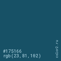 Цвет #175166 в цветовой модели RGB обозначается тремя октетами (23, 81, 102) в десятичном формате и #175166 в шестнадцатиричном (hex) формате, которые являются интенсивностью красного 23 (hex 17), интенсивность зелёного 81 (hex 51) и интенсивность синего 102 (hex 66).