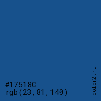 Цвет #17518C в цветовой модели RGB обозначается тремя октетами (23, 81, 140) в десятичном формате и #17518C в шестнадцатиричном (hex) формате, которые являются интенсивностью красного 23 (hex 17), интенсивность зелёного 81 (hex 51) и интенсивность синего 140 (hex 8C).
