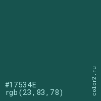 Цвет #17534E в цветовой модели RGB обозначается тремя октетами (23, 83, 78) в десятичном формате и #17534E в шестнадцатиричном (hex) формате, которые являются интенсивностью красного 23 (hex 17), интенсивность зелёного 83 (hex 53) и интенсивность синего 78 (hex 4E).