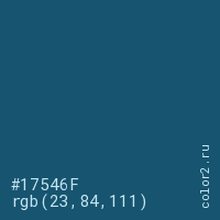 Цвет #17546F в цветовой модели RGB обозначается тремя октетами (23, 84, 111) в десятичном формате и #17546F в шестнадцатиричном (hex) формате, которые являются интенсивностью красного 23 (hex 17), интенсивность зелёного 84 (hex 54) и интенсивность синего 111 (hex 6F).