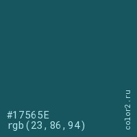 Цвет #17565E в цветовой модели RGB обозначается тремя октетами (23, 86, 94) в десятичном формате и #17565E в шестнадцатиричном (hex) формате, которые являются интенсивностью красного 23 (hex 17), интенсивность зелёного 86 (hex 56) и интенсивность синего 94 (hex 5E).