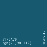 Цвет #175A70 в цветовой модели RGB обозначается тремя октетами (23, 90, 112) в десятичном формате и #175A70 в шестнадцатиричном (hex) формате, которые являются интенсивностью красного 23 (hex 17), интенсивность зелёного 90 (hex 5A) и интенсивность синего 112 (hex 70).