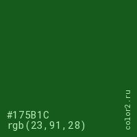Цвет #175B1C в цветовой модели RGB обозначается тремя октетами (23, 91, 28) в десятичном формате и #175B1C в шестнадцатиричном (hex) формате, которые являются интенсивностью красного 23 (hex 17), интенсивность зелёного 91 (hex 5B) и интенсивность синего 28 (hex 1C).