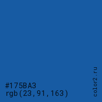 Цвет #175BA3 в цветовой модели RGB обозначается тремя октетами (23, 91, 163) в десятичном формате и #175BA3 в шестнадцатиричном (hex) формате, которые являются интенсивностью красного 23 (hex 17), интенсивность зелёного 91 (hex 5B) и интенсивность синего 163 (hex A3).
