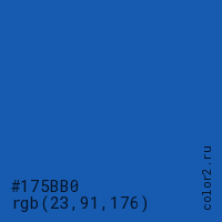 Цвет #175BB0 в цветовой модели RGB обозначается тремя октетами (23, 91, 176) в десятичном формате и #175BB0 в шестнадцатиричном (hex) формате, которые являются интенсивностью красного 23 (hex 17), интенсивность зелёного 91 (hex 5B) и интенсивность синего 176 (hex B0).