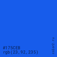 Цвет #175CEB в цветовой модели RGB обозначается тремя октетами (23, 92, 235) в десятичном формате и #175CEB в шестнадцатиричном (hex) формате, которые являются интенсивностью красного 23 (hex 17), интенсивность зелёного 92 (hex 5C) и интенсивность синего 235 (hex EB).