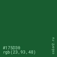 Цвет #175D30 в цветовой модели RGB обозначается тремя октетами (23, 93, 48) в десятичном формате и #175D30 в шестнадцатиричном (hex) формате, которые являются интенсивностью красного 23 (hex 17), интенсивность зелёного 93 (hex 5D) и интенсивность синего 48 (hex 30).