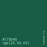 Цвет #175D45 в цветовой модели RGB обозначается тремя октетами (23, 93, 69) в десятичном формате и #175D45 в шестнадцатиричном (hex) формате, которые являются интенсивностью красного 23 (hex 17), интенсивность зелёного 93 (hex 5D) и интенсивность синего 69 (hex 45).
