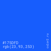 Цвет #175DFD в цветовой модели RGB обозначается тремя октетами (23, 93, 253) в десятичном формате и #175DFD в шестнадцатиричном (hex) формате, которые являются интенсивностью красного 23 (hex 17), интенсивность зелёного 93 (hex 5D) и интенсивность синего 253 (hex FD).