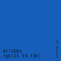 Цвет #175EBA в цветовой модели RGB обозначается тремя октетами (23, 94, 186) в десятичном формате и #175EBA в шестнадцатиричном (hex) формате, которые являются интенсивностью красного 23 (hex 17), интенсивность зелёного 94 (hex 5E) и интенсивность синего 186 (hex BA).