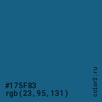 Цвет #175F83 в цветовой модели RGB обозначается тремя октетами (23, 95, 131) в десятичном формате и #175F83 в шестнадцатиричном (hex) формате, которые являются интенсивностью красного 23 (hex 17), интенсивность зелёного 95 (hex 5F) и интенсивность синего 131 (hex 83).