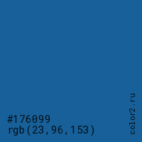 Цвет #176099 в цветовой модели RGB обозначается тремя октетами (23, 96, 153) в десятичном формате и #176099 в шестнадцатиричном (hex) формате, которые являются интенсивностью красного 23 (hex 17), интенсивность зелёного 96 (hex 60) и интенсивность синего 153 (hex 99).