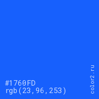 Цвет #1760FD в цветовой модели RGB обозначается тремя октетами (23, 96, 253) в десятичном формате и #1760FD в шестнадцатиричном (hex) формате, которые являются интенсивностью красного 23 (hex 17), интенсивность зелёного 96 (hex 60) и интенсивность синего 253 (hex FD).