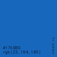 Цвет #1768BD в цветовой модели RGB обозначается тремя октетами (23, 104, 189) в десятичном формате и #1768BD в шестнадцатиричном (hex) формате, которые являются интенсивностью красного 23 (hex 17), интенсивность зелёного 104 (hex 68) и интенсивность синего 189 (hex BD).