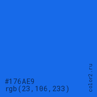 Цвет #176AE9 в цветовой модели RGB обозначается тремя октетами (23, 106, 233) в десятичном формате и #176AE9 в шестнадцатиричном (hex) формате, которые являются интенсивностью красного 23 (hex 17), интенсивность зелёного 106 (hex 6A) и интенсивность синего 233 (hex E9).