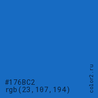 Цвет #176BC2 в цветовой модели RGB обозначается тремя октетами (23, 107, 194) в десятичном формате и #176BC2 в шестнадцатиричном (hex) формате, которые являются интенсивностью красного 23 (hex 17), интенсивность зелёного 107 (hex 6B) и интенсивность синего 194 (hex C2).