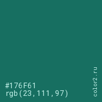 Цвет #176F61 в цветовой модели RGB обозначается тремя октетами (23, 111, 97) в десятичном формате и #176F61 в шестнадцатиричном (hex) формате, которые являются интенсивностью красного 23 (hex 17), интенсивность зелёного 111 (hex 6F) и интенсивность синего 97 (hex 61).