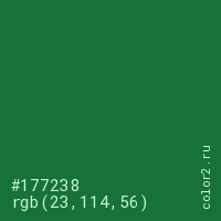 Цвет #177238 в цветовой модели RGB обозначается тремя октетами (23, 114, 56) в десятичном формате и #177238 в шестнадцатиричном (hex) формате, которые являются интенсивностью красного 23 (hex 17), интенсивность зелёного 114 (hex 72) и интенсивность синего 56 (hex 38).