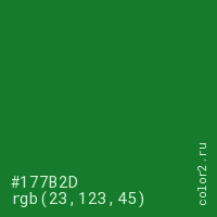 Цвет #177B2D в цветовой модели RGB обозначается тремя октетами (23, 123, 45) в десятичном формате и #177B2D в шестнадцатиричном (hex) формате, которые являются интенсивностью красного 23 (hex 17), интенсивность зелёного 123 (hex 7B) и интенсивность синего 45 (hex 2D).