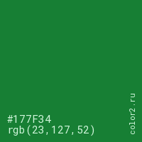 Цвет #177F34 в цветовой модели RGB обозначается тремя октетами (23, 127, 52) в десятичном формате и #177F34 в шестнадцатиричном (hex) формате, которые являются интенсивностью красного 23 (hex 17), интенсивность зелёного 127 (hex 7F) и интенсивность синего 52 (hex 34).