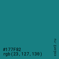 Цвет #177F82 в цветовой модели RGB обозначается тремя октетами (23, 127, 130) в десятичном формате и #177F82 в шестнадцатиричном (hex) формате, которые являются интенсивностью красного 23 (hex 17), интенсивность зелёного 127 (hex 7F) и интенсивность синего 130 (hex 82).