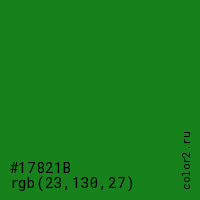 Цвет #17821B в цветовой модели RGB обозначается тремя октетами (23, 130, 27) в десятичном формате и #17821B в шестнадцатиричном (hex) формате, которые являются интенсивностью красного 23 (hex 17), интенсивность зелёного 130 (hex 82) и интенсивность синего 27 (hex 1B).