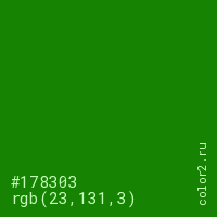 Цвет #178303 в цветовой модели RGB обозначается тремя октетами (23, 131, 3) в десятичном формате и #178303 в шестнадцатиричном (hex) формате, которые являются интенсивностью красного 23 (hex 17), интенсивность зелёного 131 (hex 83) и интенсивность синего 3 (hex 03).