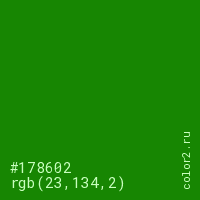 Цвет #178602 в цветовой модели RGB обозначается тремя октетами (23, 134, 2) в десятичном формате и #178602 в шестнадцатиричном (hex) формате, которые являются интенсивностью красного 23 (hex 17), интенсивность зелёного 134 (hex 86) и интенсивность синего 2 (hex 02).