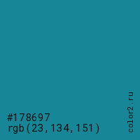 Цвет #178697 в цветовой модели RGB обозначается тремя октетами (23, 134, 151) в десятичном формате и #178697 в шестнадцатиричном (hex) формате, которые являются интенсивностью красного 23 (hex 17), интенсивность зелёного 134 (hex 86) и интенсивность синего 151 (hex 97).