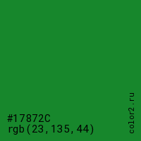 Цвет #17872C в цветовой модели RGB обозначается тремя октетами (23, 135, 44) в десятичном формате и #17872C в шестнадцатиричном (hex) формате, которые являются интенсивностью красного 23 (hex 17), интенсивность зелёного 135 (hex 87) и интенсивность синего 44 (hex 2C).
