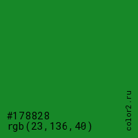 Цвет #178828 в цветовой модели RGB обозначается тремя октетами (23, 136, 40) в десятичном формате и #178828 в шестнадцатиричном (hex) формате, которые являются интенсивностью красного 23 (hex 17), интенсивность зелёного 136 (hex 88) и интенсивность синего 40 (hex 28).