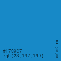 Цвет #1789C7 в цветовой модели RGB обозначается тремя октетами (23, 137, 199) в десятичном формате и #1789C7 в шестнадцатиричном (hex) формате, которые являются интенсивностью красного 23 (hex 17), интенсивность зелёного 137 (hex 89) и интенсивность синего 199 (hex C7).