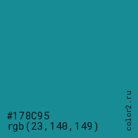 Цвет #178C95 в цветовой модели RGB обозначается тремя октетами (23, 140, 149) в десятичном формате и #178C95 в шестнадцатиричном (hex) формате, которые являются интенсивностью красного 23 (hex 17), интенсивность зелёного 140 (hex 8C) и интенсивность синего 149 (hex 95).