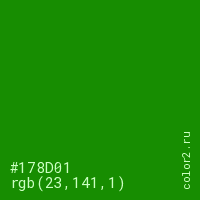 Цвет #178D01 в цветовой модели RGB обозначается тремя октетами (23, 141, 1) в десятичном формате и #178D01 в шестнадцатиричном (hex) формате, которые являются интенсивностью красного 23 (hex 17), интенсивность зелёного 141 (hex 8D) и интенсивность синего 1 (hex 01).
