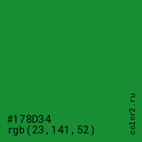 Цвет #178D34 в цветовой модели RGB обозначается тремя октетами (23, 141, 52) в десятичном формате и #178D34 в шестнадцатиричном (hex) формате, которые являются интенсивностью красного 23 (hex 17), интенсивность зелёного 141 (hex 8D) и интенсивность синего 52 (hex 34).